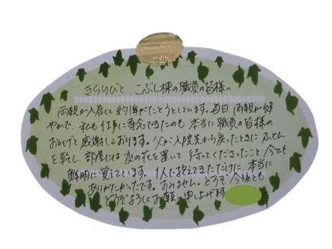 自分たちの計画で、手作りのクリスマスはあっという間に時間が流れ、入居者様・ご家族さま楽しんで頂けた様子でした。ありがとうございました。そして、お疲れ様でした。